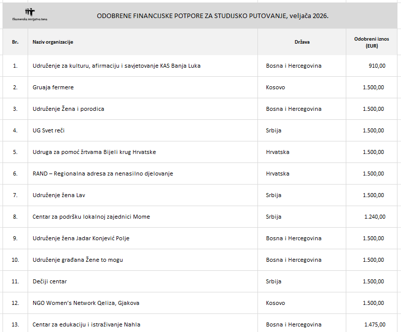 Kroz svoj program dodjele financijskih potpora za studijska putovanja, Ekumenska inicijativa žena (EIŽ) bazičnim ženskim organizacijama želi omogućiti umrežavanje, razmjenu znanja te uvid u primjere dobre prakse s ciljem osiguravanja njihovog razvoja i održivosti, kao i poticanja zajedničkog aktivizma na lokalnoj, državnoj i / ili regionalnoj razini.